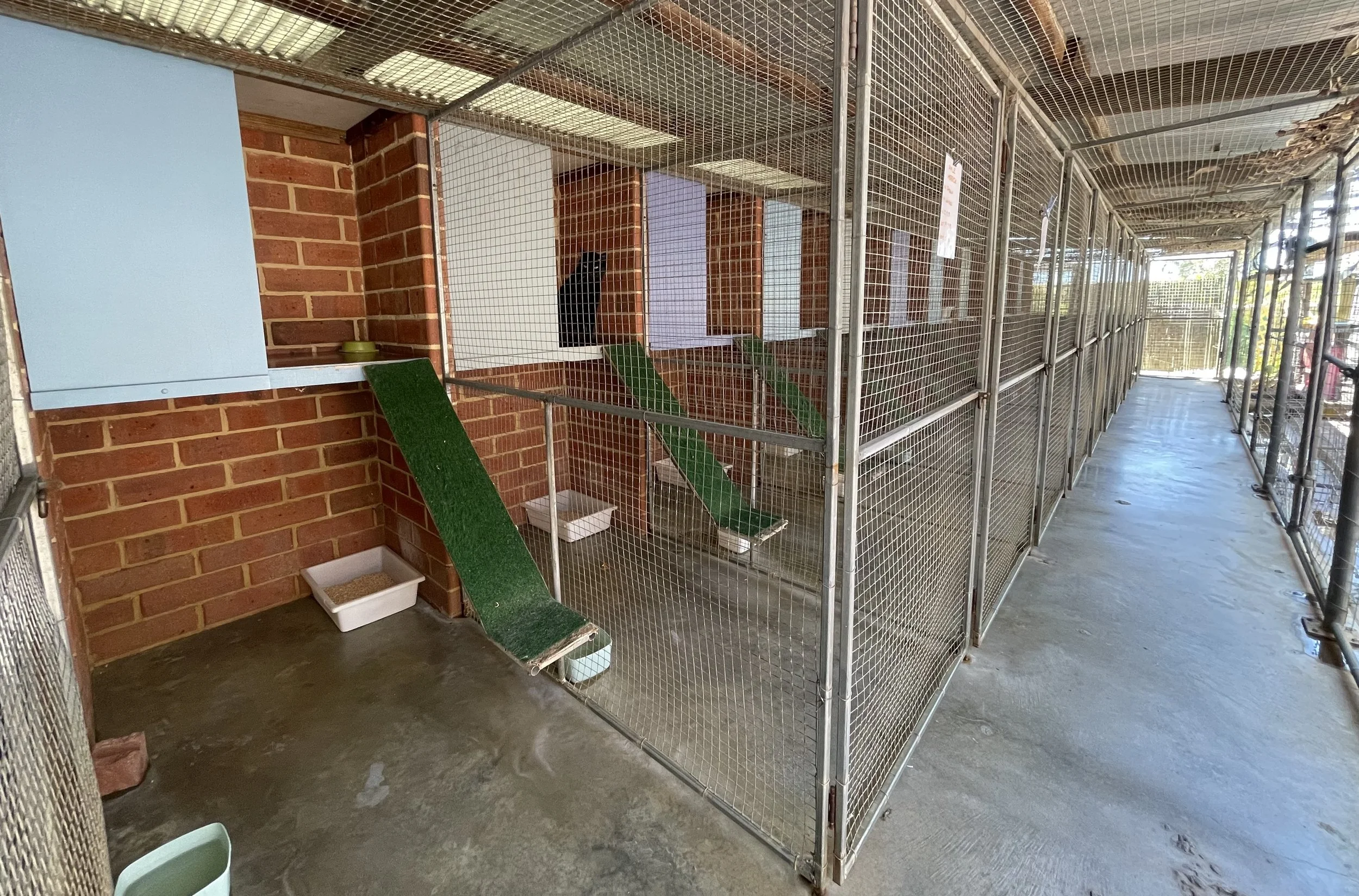 Walk-in cat pens, all fully roofed and securely fenced with access to garden style exercise areas.