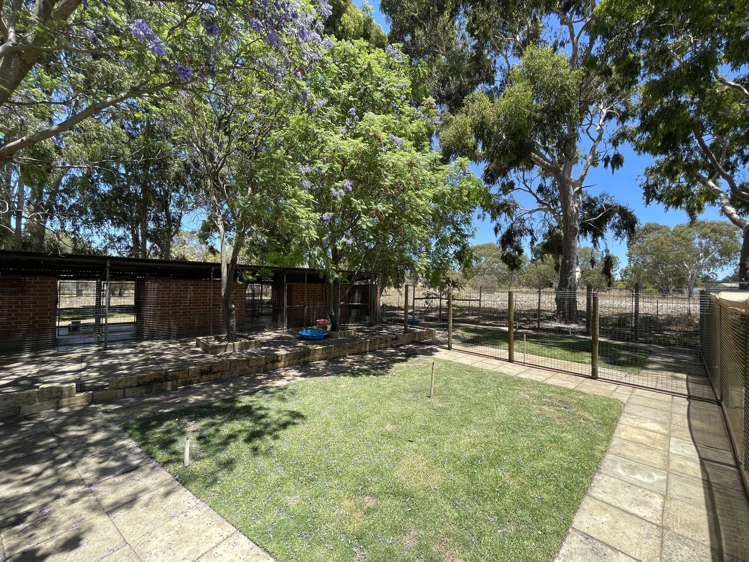 Separate small and large dog facilities under large shady trees with fully fenced exercise areas.